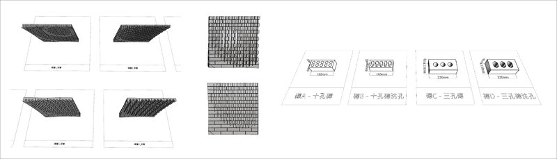 四組試做單元( 1 米 X 1 米),我們使用多孔紅磚+透明樹酯來製作,以機械手臂持「手持式砂輪機」配合適當的刀具進行切削,四組磚牆以不同的磚塊堆疊,並用同樣的球面進行切削,以完成的mockup 效果來決定的成品的磚塊的形式。