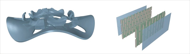 以完整的平面材料,如局部切割的彈性布料填充發泡劑,並利用熱融膠以不同路徑、密度塗在布料上,控制布料的延展性。發泡劑在雙層布料氣囊中自然膨脹時,就可能可以產生不同的厚度、延展程度、彎曲程度,從而測試產出各種曲面的立體形狀。