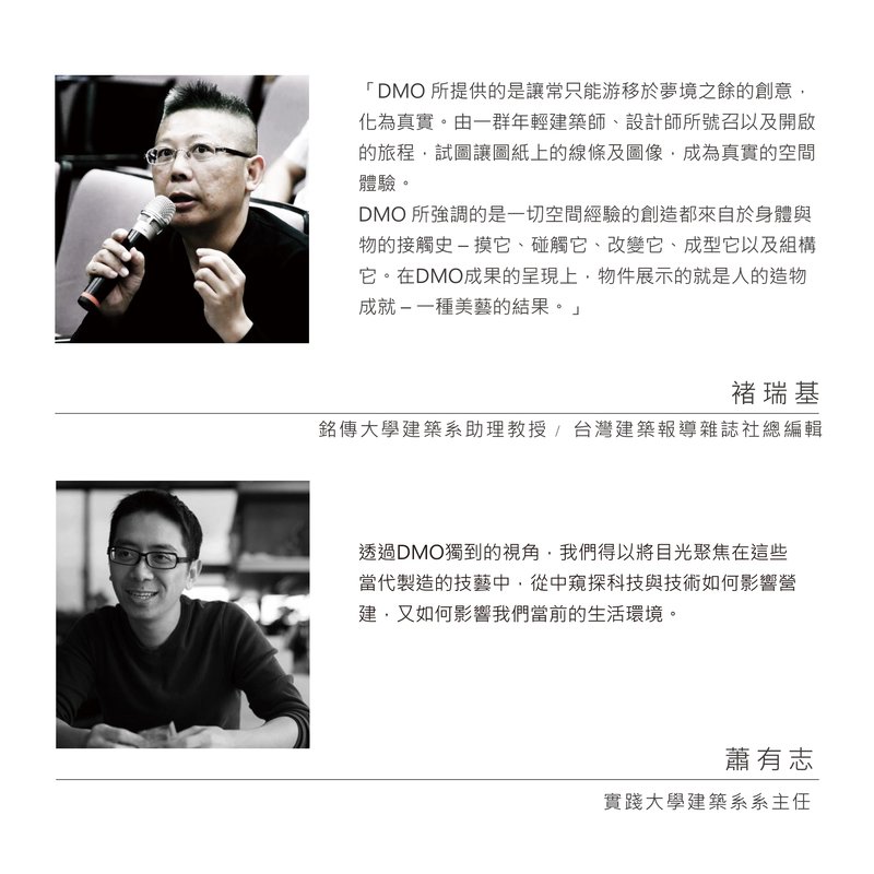 DMO (Design & Make Organization)我們是一群從事及熱愛建築與空間設計的人,在追求前衛、冒險、創新的設計工作之餘,秉持社群分享的精神,在台灣推動國際化的建築與空間設計技術,以研究、實驗、實做及教學,企圖在台灣建立數位設計及製造專業的創新先進知識技術的交流平台。