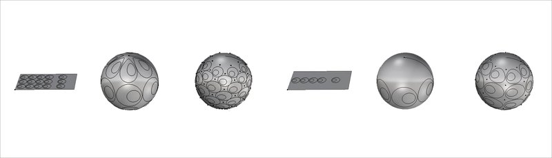 曲面上的分割/開孔/形態,經過攤平後再進行製造時,常會有形變的情況發生。透過了解材料的係數,以及加工方式,試製造出加工後,經變形才變為欲達到之分割 / 開孔 / 型態。實做流程上,期以整合由 3D 軟體界面可直接輸出至 CAM 硬體中。