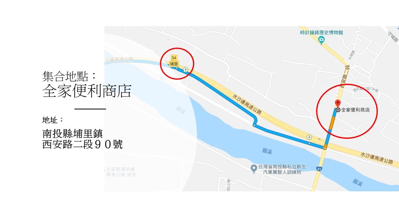 *不論是否搭乘大眾交通運輸工具,我們會跟您約晚上22點10分在埔里鎮上的肯德基(大眾交通工具)、國道六號下的全家見面(自行開車),並接您到園區。