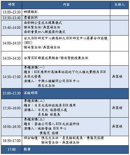 南臺灣都市發展帶動大型新建工程,南部產業的勢力不容小覷,本次趨勢論壇由高雄科技大學吳翌禎教授主持,邀請中興工程的陳志文BIM中心主任分享「BIM應用於高雄車站段地下化工程之實務及BIM未來之發展」,以及日月光廠務環工處的易良翰副處長分享「日月光高科技廠房BIM應用」,還有瑞助營造的黃隆茂協理分享「營造公司導入BIM之效益評估」,將與大家分享目前南部產業應用發展現況與使用經驗,希望各界先進共襄盛舉一同討論交流。