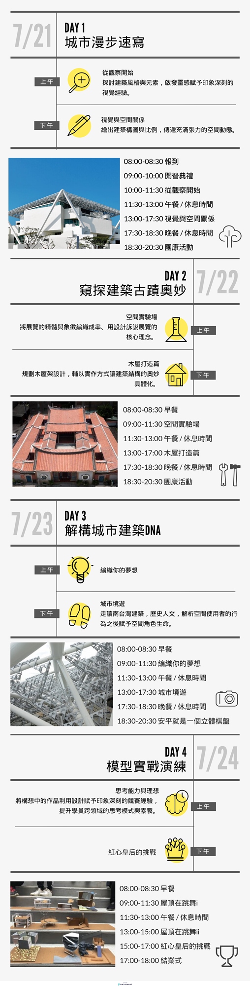 跨領域的業界講師,涵蓋建築、設計、藝術領域,帶來四天三夜的精選設計課程,透過實地走訪知名建築與藝師面對面方式,引領學員走入城市中,細細品味建築設計的特色與用心之處,體驗建築設計產業的魅力,陪伴學員親身貼近產業的實務面,感受其中的挑戰與樂趣,今夏來點不一樣的挑戰,跟著我們玩轉台南!