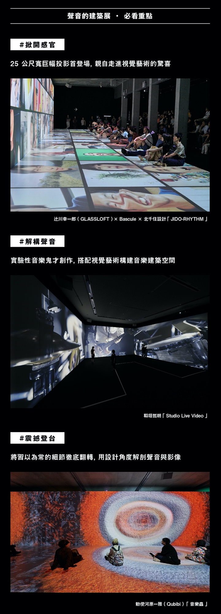 打造這場超乎聲音與藝術純粹的音樂空間,以不同影像重複表現同一首樂曲,來構建出一場視覺與聽覺完美熔接的聲音建築展,邀請你親自走進超現實場域!