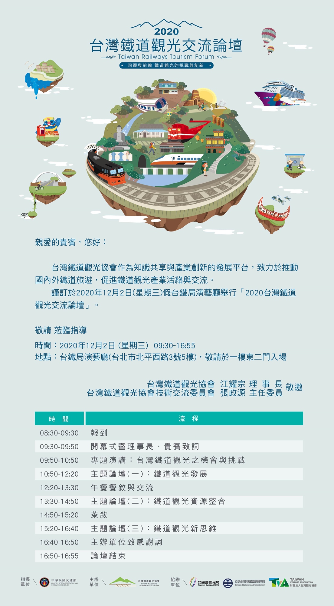 鐵道觀光趨勢逐漸成長,「台灣鐵道觀光協會」應運而生,期盼鏈結臺灣鐵道、觀光與在地文化,作為知識共享與產業創新的發展平台。2020台灣鐵道觀光交流論壇,以【回顧與前瞻 鐵道觀光的挑戰與創新】為主題,希望藉由論壇意見領袖分享臺灣鐵道觀光,帶動臺灣鐵道觀光熱潮!