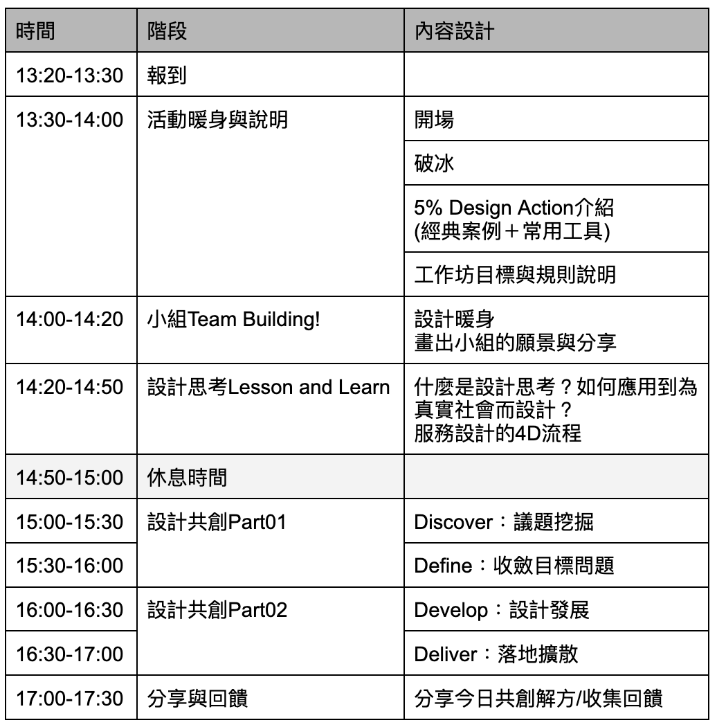 5% Design Action社會設計平台以「設計行動」之專案形式募集跨領域的設計師與專業人士,共同投入5%的業餘時間,將原本運用在企業創新上的專業知識與設計能力,貢獻於社會關鍵課題及挑戰之中。另一方面,專案過程也以「服務設計方法」為核心,串連與設計議題相關的公部門、NPO組織、私部門一起進行價值共創,找尋可能的創新機會與解決方案。