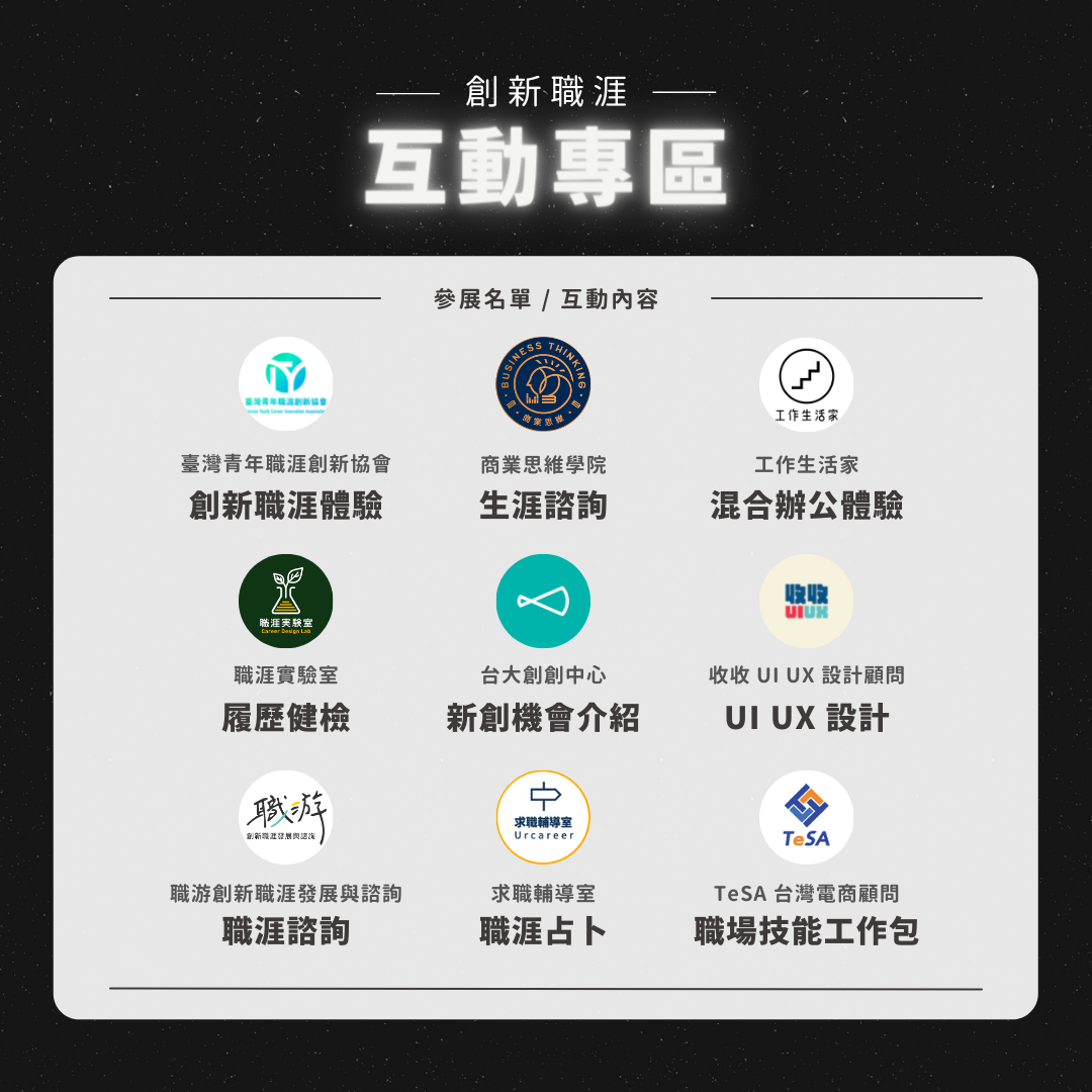 Kloudless, a Netskope company ⎮ GoFreight ⎮ Affiliates.One 聯盟網 ⎮ Omnichat ⎮ Vpon ⎮ 新加坡商鈦坦科技 ⎮ KKday ⎮ iCi en orbite ⎮ XREX 鏈科股份有限公司 ⎮ Ganzin 見臻科技 ⎮ 天下雜誌群 ⎮ 商業思維學院 ⎮ 台大創創中心 ⎮ 職涯實驗室 ⎮ 職游創新職涯發展與諮詢 ⎮ 微軟工作生活家 ⎮ 台灣青年職涯創新協會 ⎮ foodpanda 台灣總部 ⎮ SHOPLINE Limited ⎮ Flash Coffee 閃電咖啡 ⎮ eCloudvalley ⎮ Oursky ⎮ 收收UI UX 設計顧問