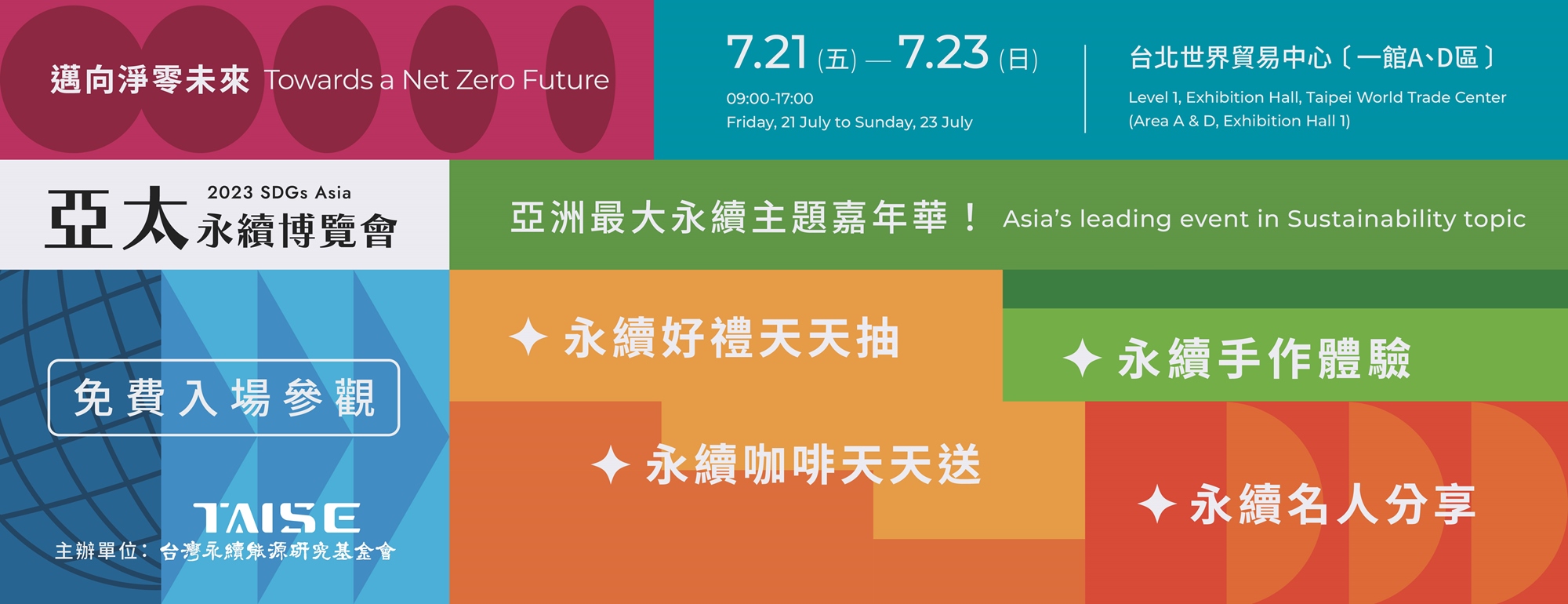 全臺最大永續嘉年華~「2023亞太永續博覽會」將於7月21-23日在臺北世貿一館登場;今年主題聚焦「邁向淨零未來」(Towards a Net Zero Future),集合中央與地方政府、企業、學校、NGO等近百家國內外參展單位交流,即日起開放各界民眾免費報名參觀。延續首屆展會的豐厚成果,今年活動包括亞太永續展、亞太永續高峰會、亞太永續論壇、亞太暨台灣永續行動獎及永續倡議活動等五大主軸。
