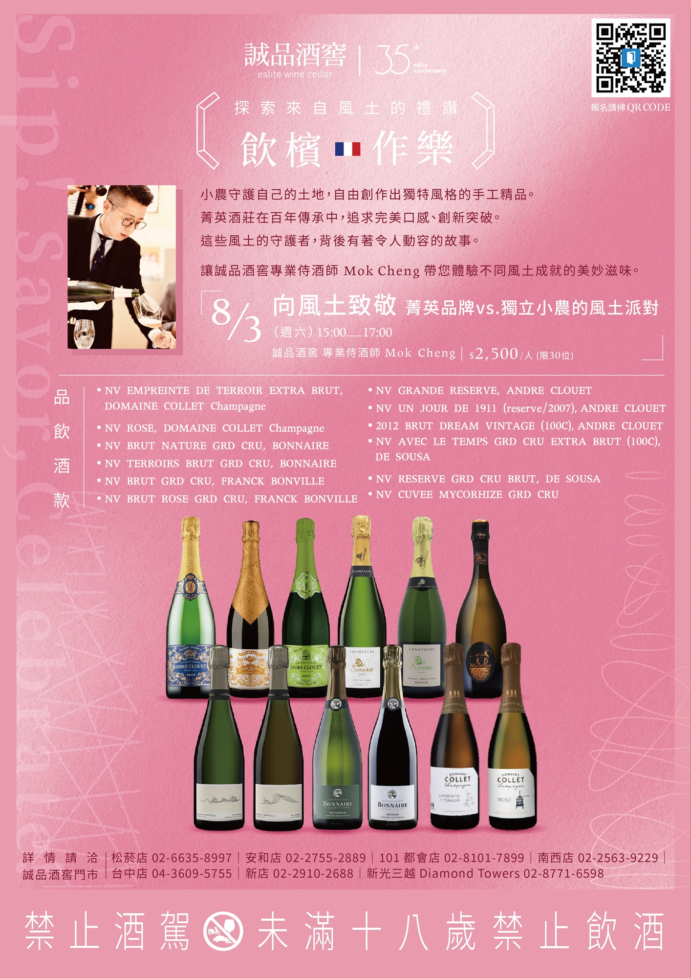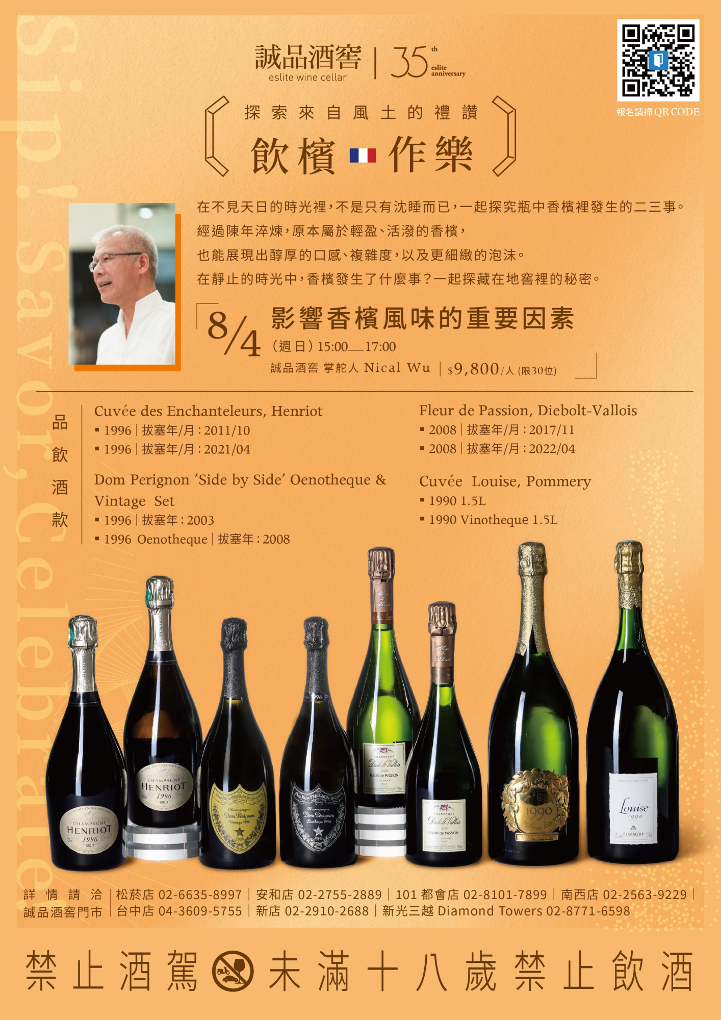 1989 年誠品創立至今,從閱讀出發,體驗人文、藝術、創意與生活的美好,2024 適逢 35 周年,誠品酒窖特別以長久以來象徵著勝利、喜悅和慶祝的香檳為主題,舉辦台灣首屆【誠品酒窖 法國香檳博覽會】:集結來自香檳區 46 個品牌、超過 450 款精選特釀、8,000 瓶以上豐富酒藏,從經典永恆,到獨立創新小農、菁英品牌,與稀有老年份香檳,讓無論是香檳新手或者高階品飲行家體驗不同風土帶來的美妙滋味。