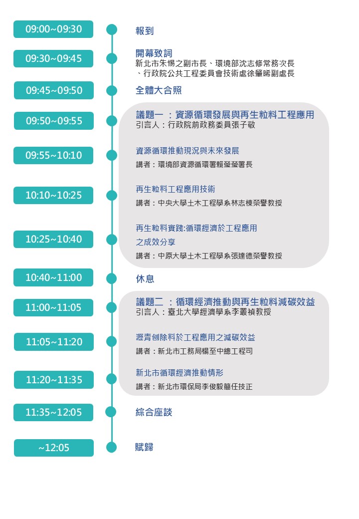 邀請國內再生粒料領域專家學者、環境部、行政院公共工程委員會及新北市政府工務局,透過不同角度探討「再生粒料」運用於推動綠色工程,創造循環經濟的發展現況,深入剖析再生粒料的策略與實踐。