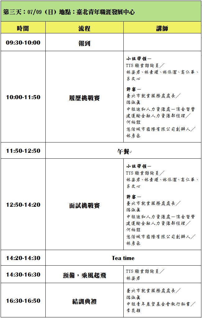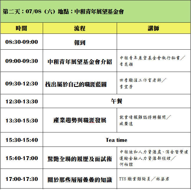 為幫助青年朋友進一步瞭解個人特質、職業種類、與職場環境與現況,TYS與中租青年展望基金會一同辦理為期三日的營隊活動,透過課程、互動式遊戲及企業參訪等多元的活動內容,讓青年能從中探索職涯、學習團隊合作以及建構職場知識,抓住未來職場契機!