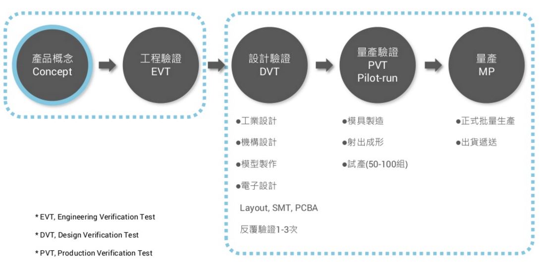 目前個人雖可利用Arduino、Raspeberry Pi、3D列印機等開發板或工具來加速將自己的創意變成原型,甚至利用Kickstarter等群募管道來進行第一桶金的募資,但無可避免地仍需面臨量產的門檻,這時製造業既有的EVT/DVT/PVT流程仍是必經的過程,Maker或硬體新創都需對可製造性設計(DFM)有所了解和掌握。