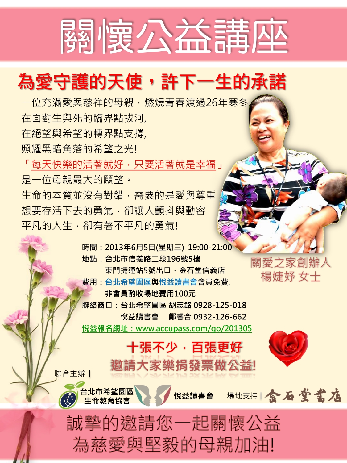 悅益讀書會2013年關懷公益講座-「為愛守護的天使,許下一生的承諾」