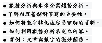 內容營銷話題如日中天,究竟哪些內容吸睛,哪些內容可以增加網站流量,哪些時候應該投放廣告?家家企業有本難念的經,要知道使用者喜好,就必須分析不同數據。犀利實例解說,帶您解剖數字與文字間的奧秘。