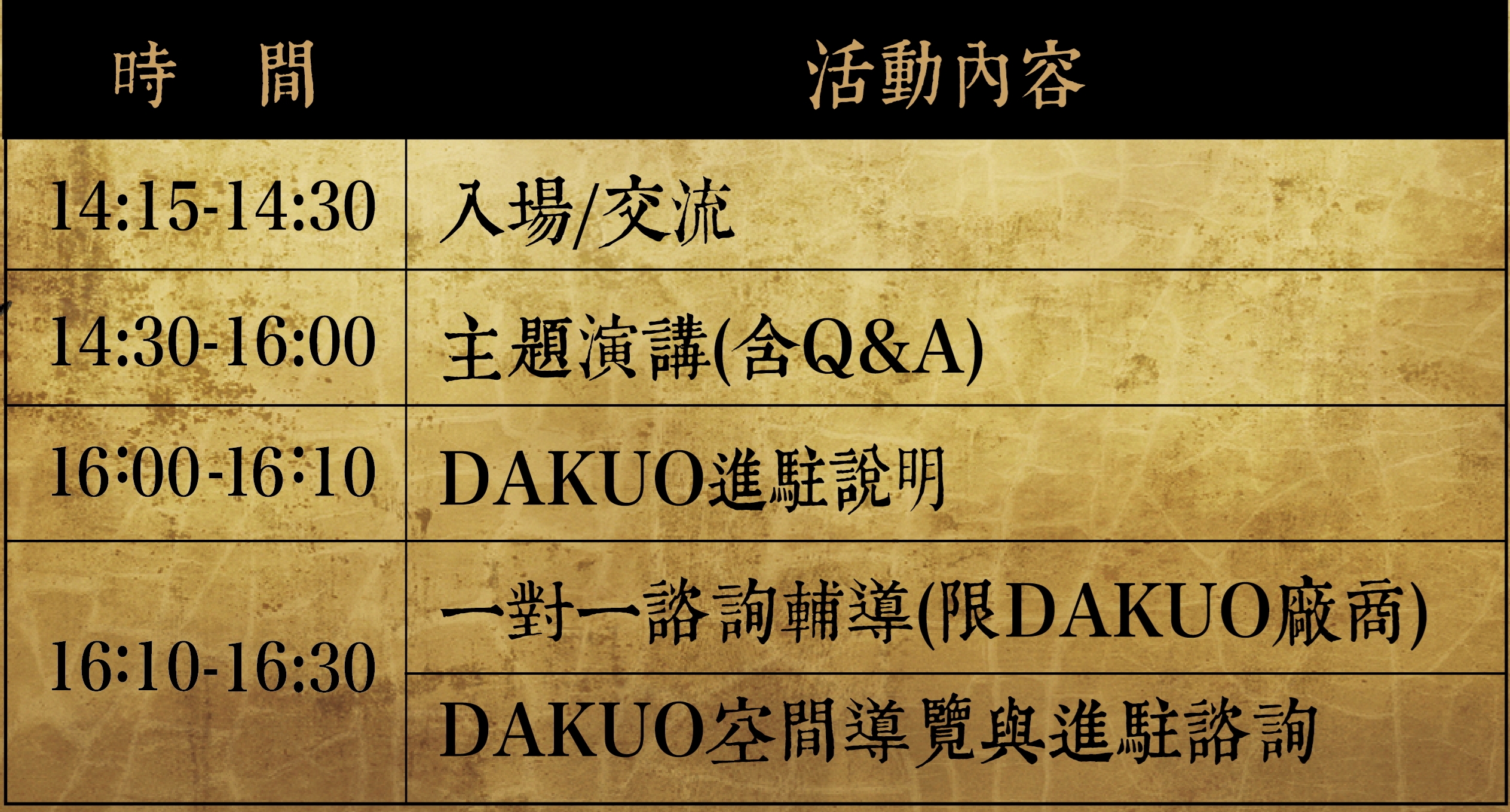 邀請已創業、創業中、想創業的朋友一起來吸收相關知識,並藉此講座了解如何進駐DAKUO中心。