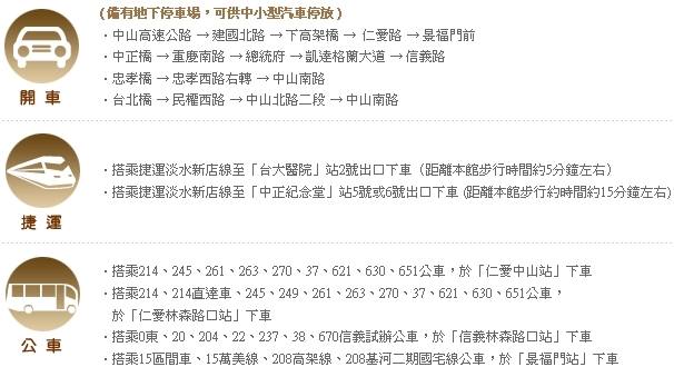 張榮發基金會國際會議中心位於路網綿密、交通便利的中山南路上,正對凱達格蘭大道,緊鄰台大醫院及自由廣場 (中正紀念堂),距離台大醫院捷運站步行約5分鐘,至台北車站車程為5分鐘。