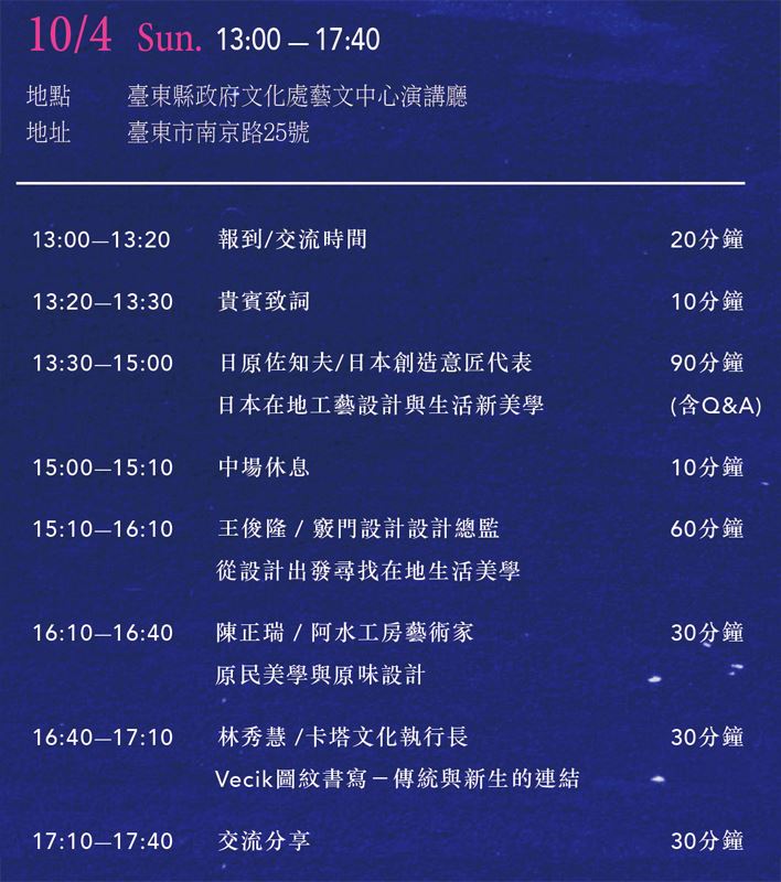 臺東在地特色工藝品牌阿水工房陳正瑞藝術家,與成功打造部落平台的卡塔品牌林秀慧執行長,將分享工藝創新與工坊經營的創作平衡與經營。