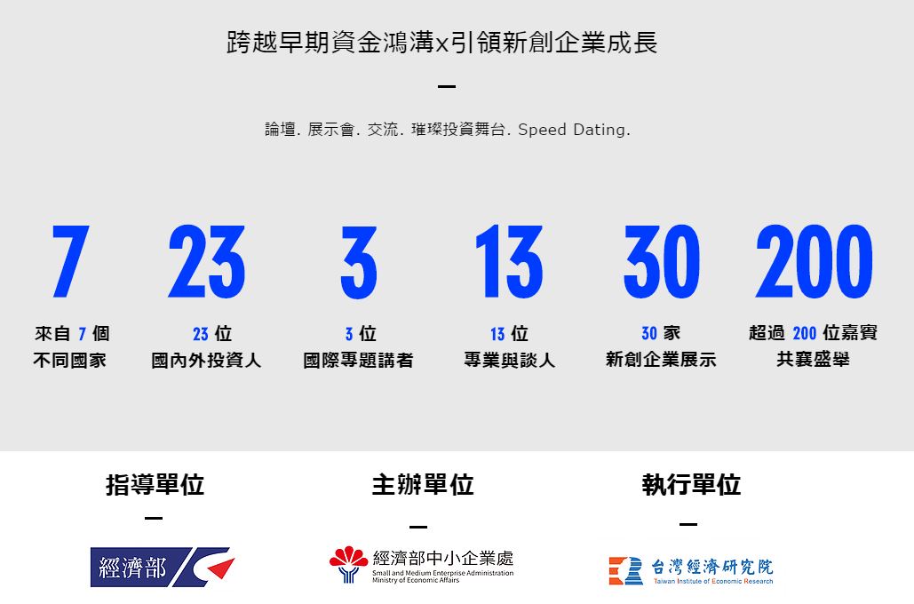 為能促進天使或早期投資的風氣,活絡國內創業生態系統的資金環境,經濟部中小企業處委託台灣經濟研究院於2016年9月6-7日在台北舉辦「2016國際天使與早期投資峰會」,主題為「跨越早期資金鴻溝 引領新創企業成長」,藉由邀請國內外知名的早期投資人參與,分享早期智慧資金的運作實務、投資經驗與對投資前景的前瞻洞見,帶動國內早期投資的風氣與提升投資績效。同時,也搭建新創企業與投資人的舞台,增加曝光度及互動交流的機會,期望共同跨越早期資金鴻溝,翻轉新世界。
