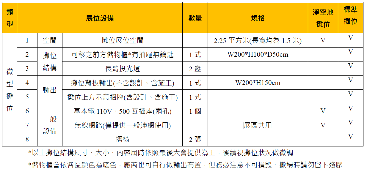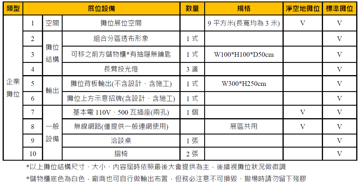 2. 以上攤位規格僅包含場地標準配備,不含其他裝潢。