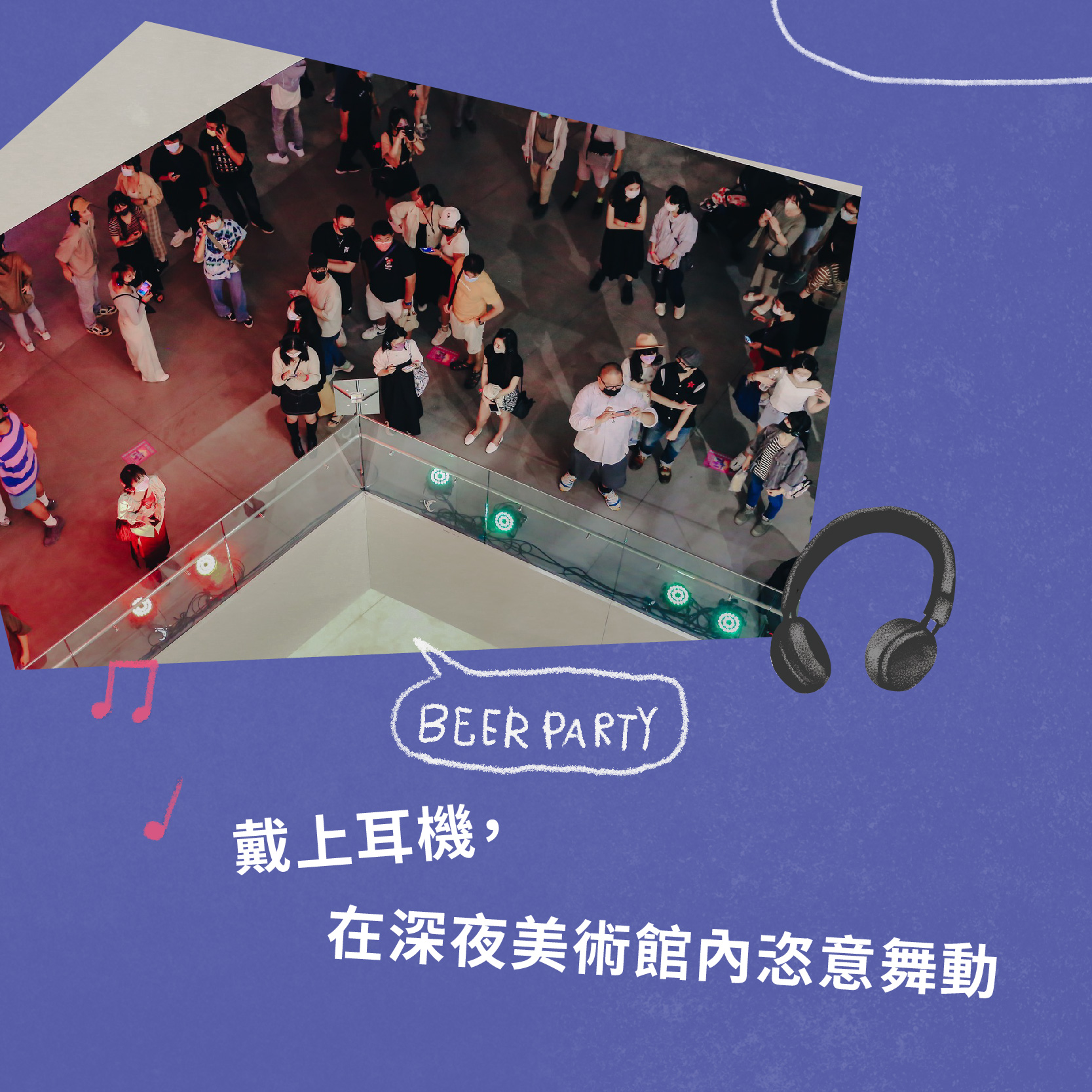 要在美術館三樓最美的J展間光影牆下跳舞,還是拿著啤酒在三樓露台李再鈐作品前《天地人和》前搖擺,戴上耳機,整個美術館只要有訊號,都是你的小舞池。