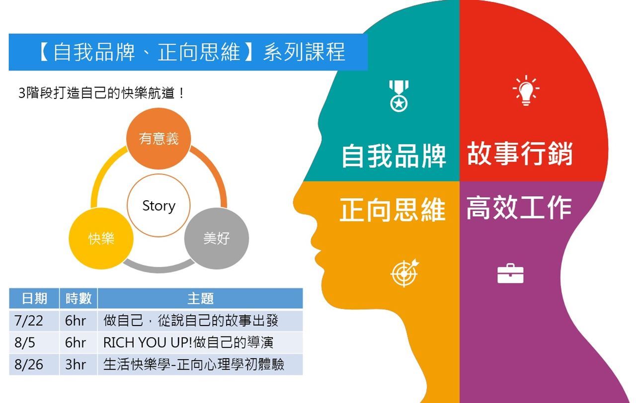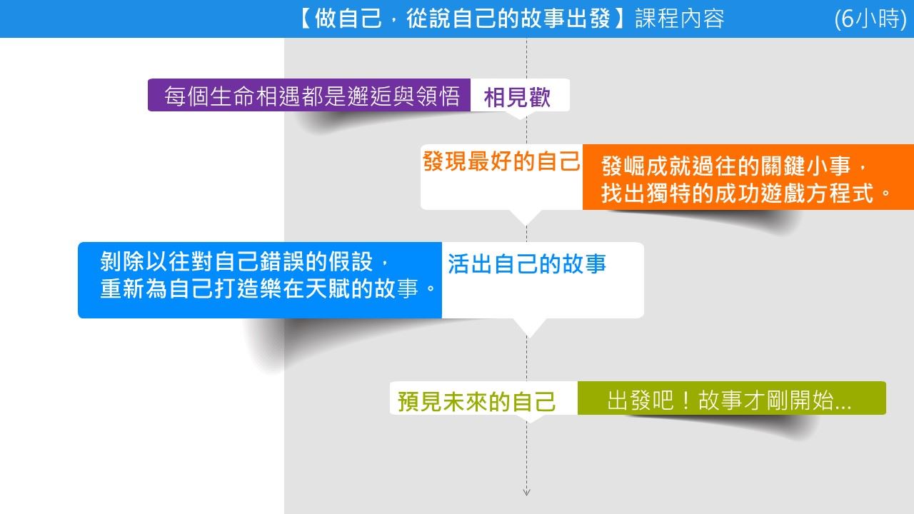 這是一堂由故事角度切入,以遊戲對話方式,幫助你重整人生及工作的腳步,重新認識自己,找出你獨特的成功遊戲方程式,發現你真正天賦所在,讓你可以兼顧工作與家庭、現實與夢想。豐富生涯規劃、工作與生活,創造屬於自己的生命故事。一切就從覺察現在的生命故事出發。