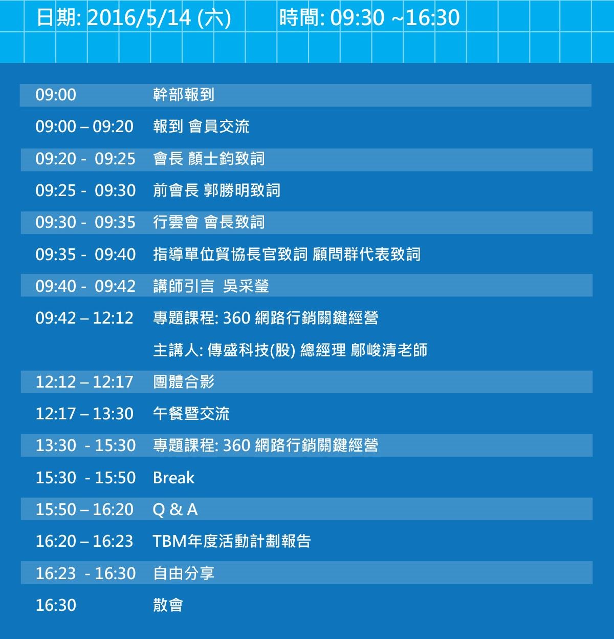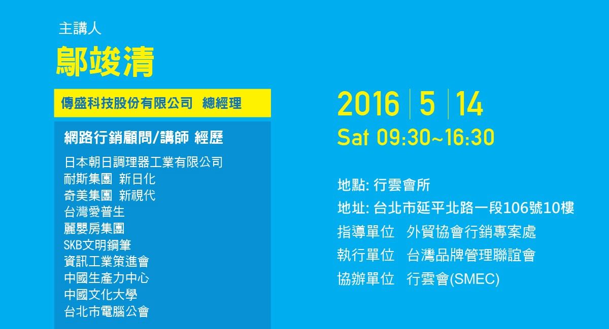 為此,行雲會特與TBM聯誼會合作,特別邀請頗負盛名, 長期於資策會、中國生產力中心等單位任教,培養網路行銷規劃顧問師並同時擔任日本朝日、奇美、麗嬰房集團等多家公司網路行銷顧問的傳盛科技股份有限公司 總經理 鄔峻清 老師,特別為會員精華選淬, 擘畫講解「360度網路整合行銷藍圖」。