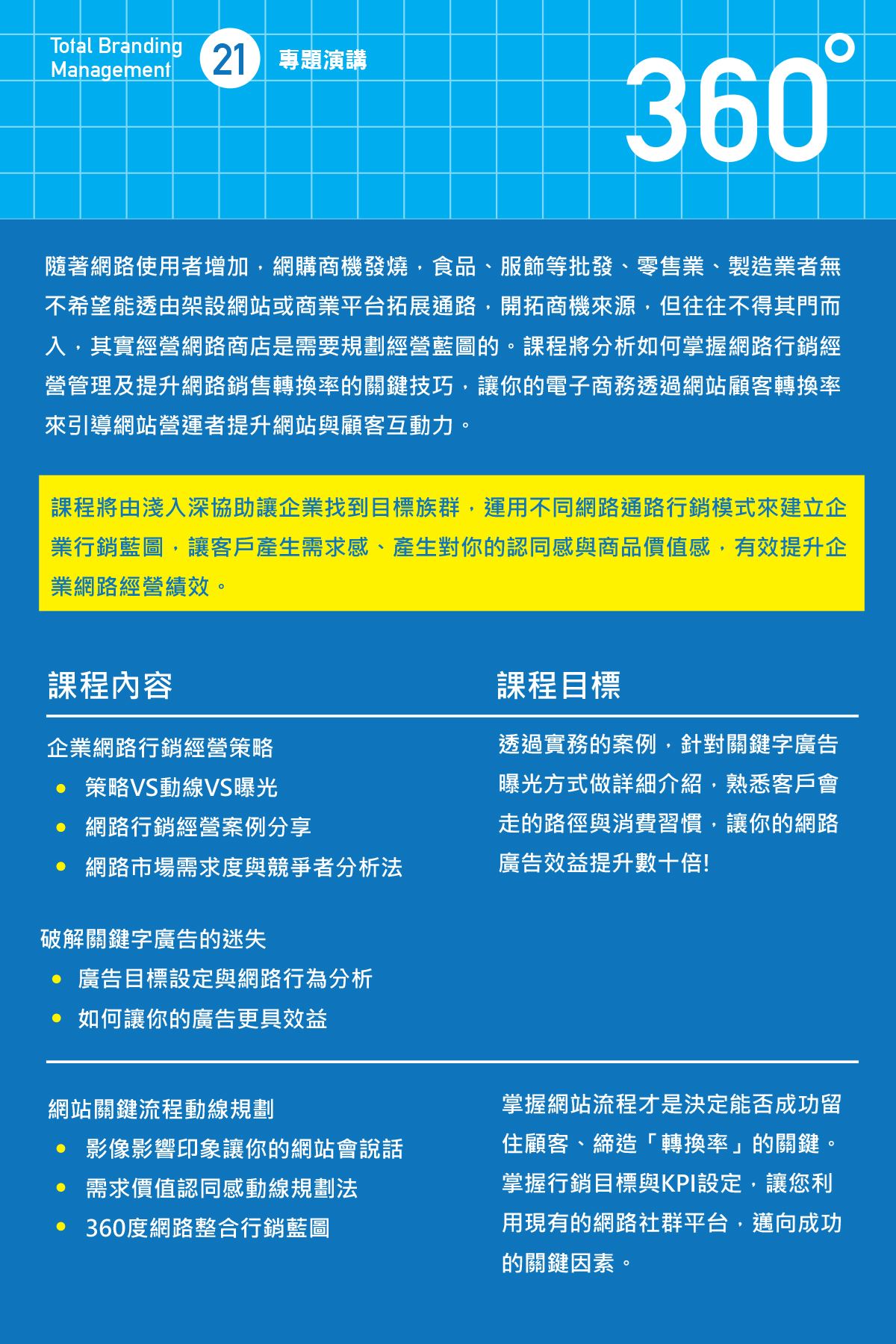 課程中告訴你企業網路行銷經營策略、破解關鍵字廣告的迷失、網站關鍵流程動線規劃, 打造需求價值認同感動線規劃法,以影像影響印象讓你的網站會說話。 帶領會員透過實務的案例,針對關鍵字廣告曝光方式做詳細介紹,熟悉客戶會走的路徑與消費習慣,讓你的網路廣告效益提升數十倍!