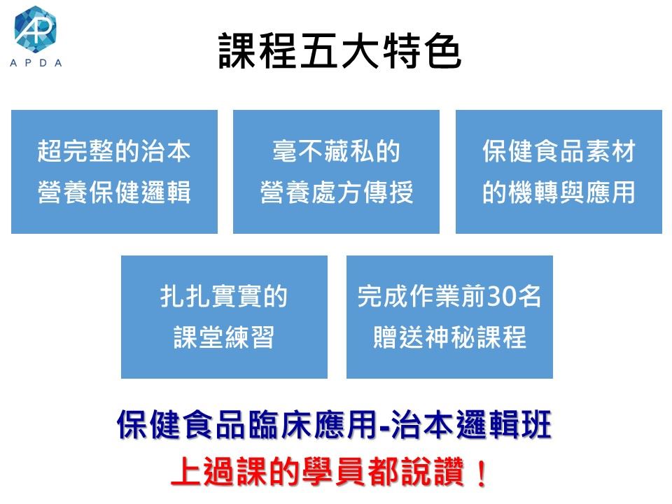 只要兩天課程,您將快速學習到多種保健食品素材的臨床應用,更能融會貫通,立即就能學會如何幫客戶搭配營養處方!