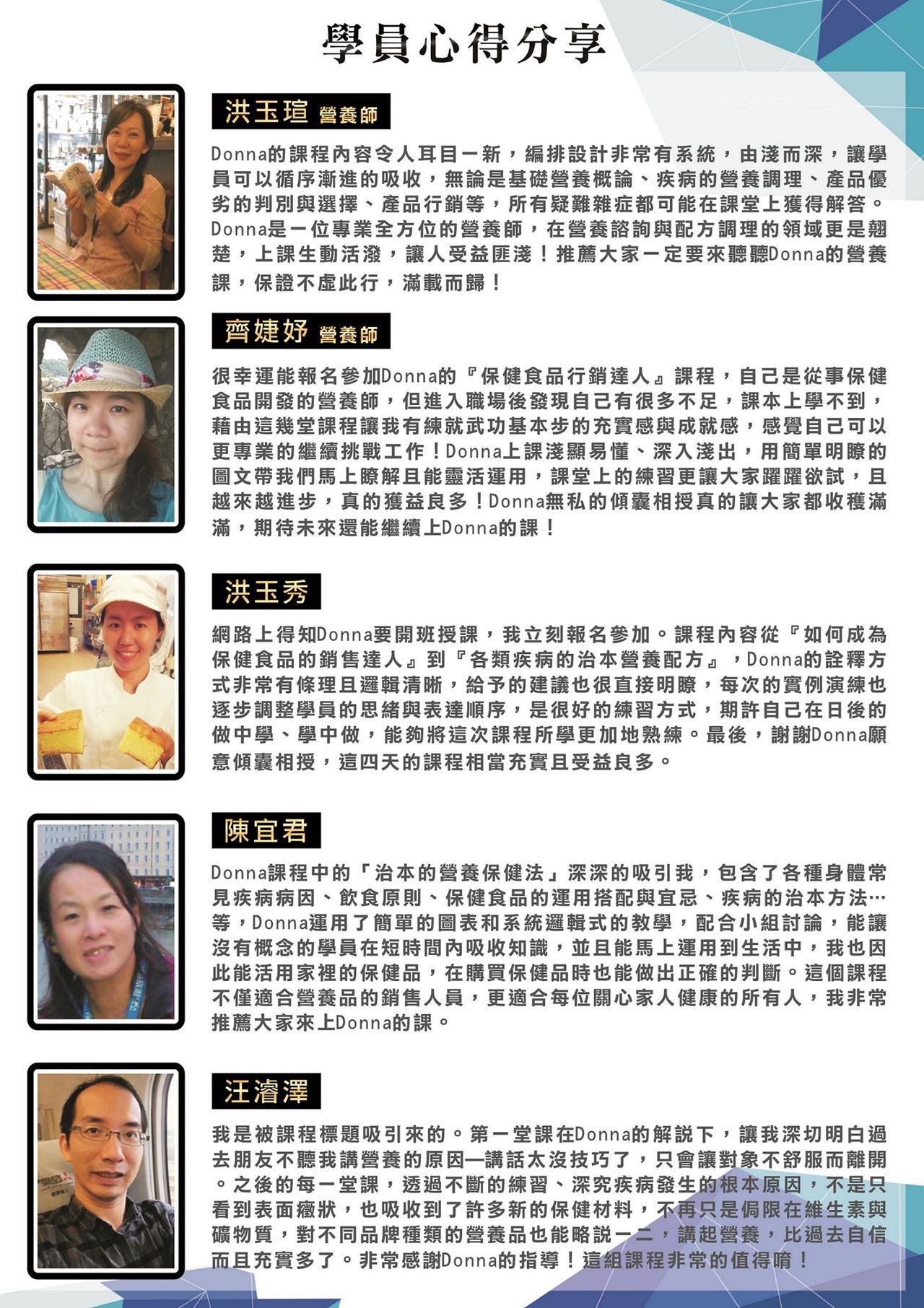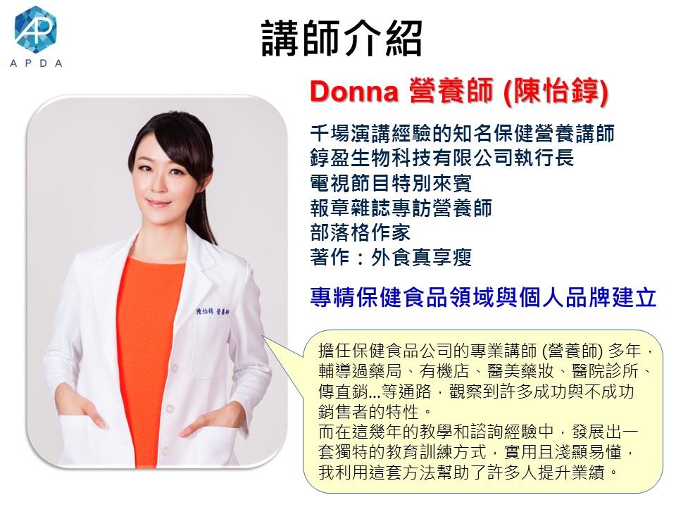 本課程邀請到在業界非常有經驗的陳怡錞營養師 (Donna) 擔任講師,曾輔導過藥局、有機店、醫美藥妝、醫院診所、傳直銷...等通路,觀察到許多成功與不成功銷售者的特性。而在九年的教學和諮詢經驗中,發展出這一套獨特的教育訓練方式,利用這套方法幫助了許多人得到健康,更讓許多人提升業績,上過課的學員都說讚!