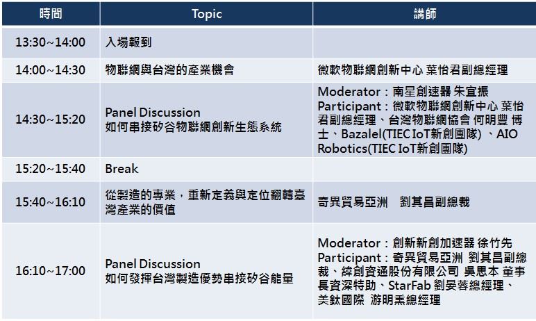 為連結全球先進科技研發能量,搶進下一世代產業,國家發展委員會及桃園市政府特舉辦「IoT新創論壇」,以創新創業經濟成長x物聯網產業升級為主題,邀請Microsoft及美商GE代表,發表專題演說;同時,也邀請國內新創團隊、產業代表,分別從軟體與硬體的角度,進行深度對談,剖析如何槓桿創新創業的動能,協助台灣物聯網產業升級。
