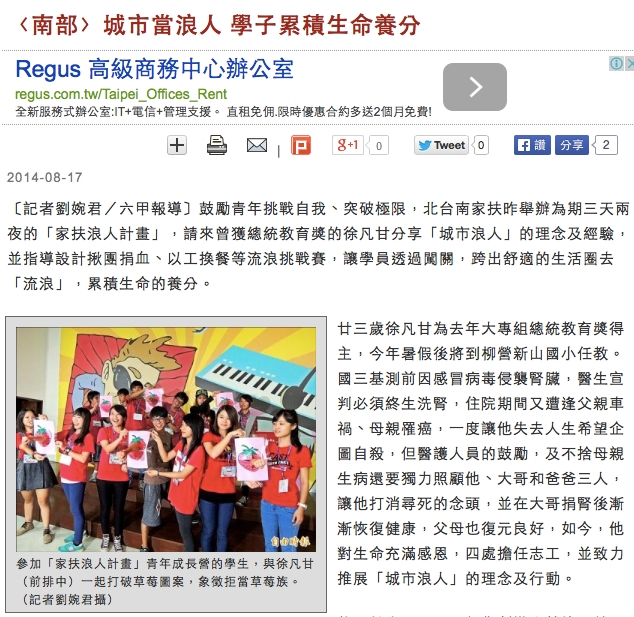 4. 自由時報: 〈南部〉城市當浪人 學子累積生命養分