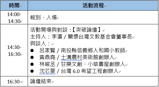 2017年度”突破論壇”系列活動聚焦於台灣青年的未來,本場次將由關懷台灣文教基金會董事長李濤主持,並邀請四位推動台灣偏鄉發展、耕耘在地文化之青年工作者進行對談:呂家賢(南投縣信義鄉人和國小教師)、黃鼎堯(土溝農村美術館創辦人)、林峻丞(甘樂文創、小草書屋創辦人)、沈芯菱(台灣6.0希望工程創辦人)。除了分享他們如何投入台灣偏鄉服務與在地發展之經驗,也將探討當前最需要突破的障礙、以及他們對台灣未來的期盼。
