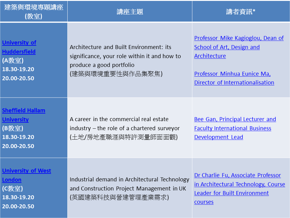正在就讀和環境與建築相關的課程嗎?或是有意在未來從事相關領域的工作?留學英國與職涯座談邀請相關科系的學生及其家長們、老師與職涯輔導人員前來參加,並由三所英國大學的講師、相關領域的專業人士與校友參與座談,分為三個主題場次:建築與環境重要性與作品集聚焦、土地 / 房地產職涯與特許測量師面面觀英國建築科技與營建管理市場需求。講座將於11月5日星期四18.30-21.30在台北犇亞會議中心6F舉行,網路報名,免費入場。