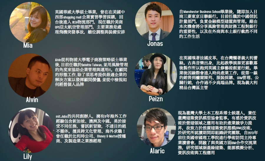 - 發掘不同產業的工作特性與未來趨勢, 橫跨科技 、 媒體、 金融、 新創、顧問 設計&製造