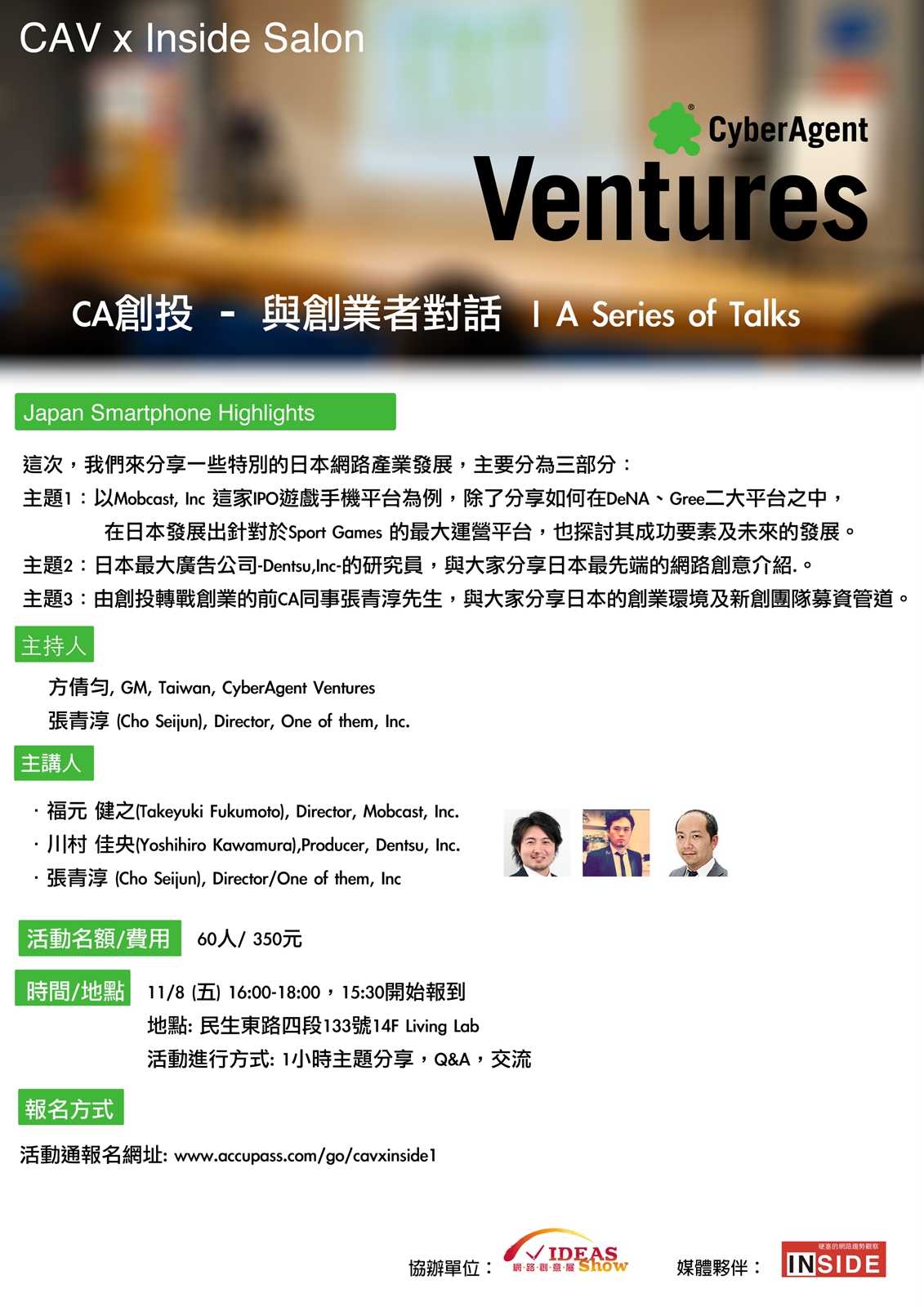 由過去任職於 CyberAgent,從創投轉戰創業的張青淳先生將分享目前日本的創業環境與新創團隊募資管道。