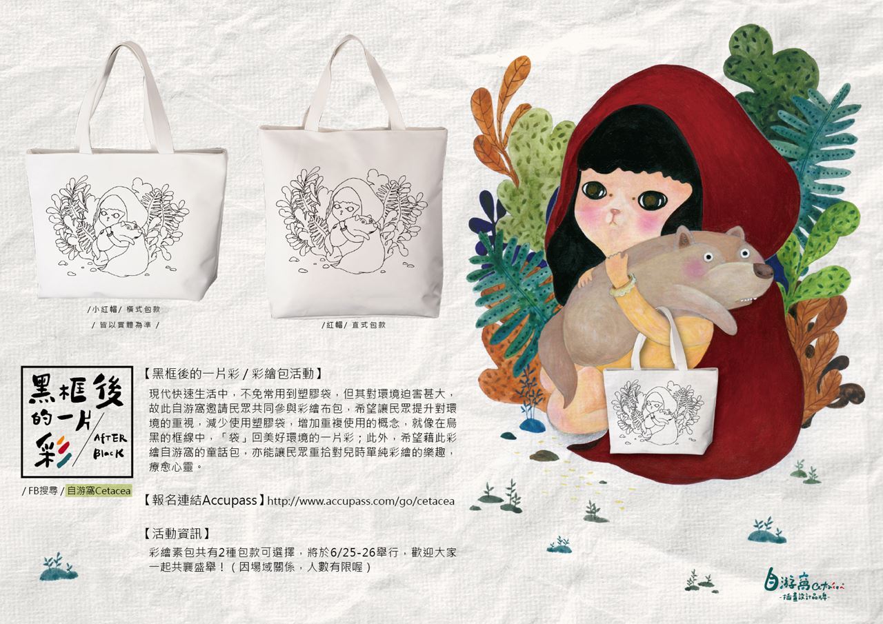 現代快速生活中,不免常用到塑膠袋,但其對環境迫害甚大,故此自游窩邀請民眾共同參與彩繪布包,希望讓民眾提升對環境的重視,減少使用塑膠袋,增加重複使用的概念,就像在烏黑的框線中,「袋」回美好環境的一片彩;此外,希望藉此彩繪自游窩的童話包,亦能讓民眾重拾對兒時單純彩繪的樂趣,療愈心靈。