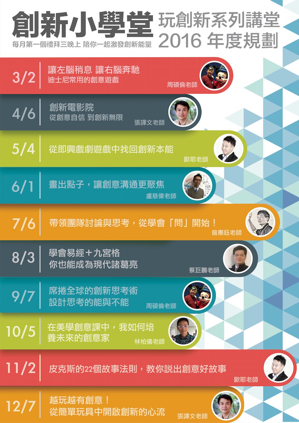 透過每個月週三晚間所舉辦的玩創新系列講堂(見下圖),為個人學習者注入創新能量,幫助學員在生活與工作中,盡情揮灑屬於自己的創意自信。
