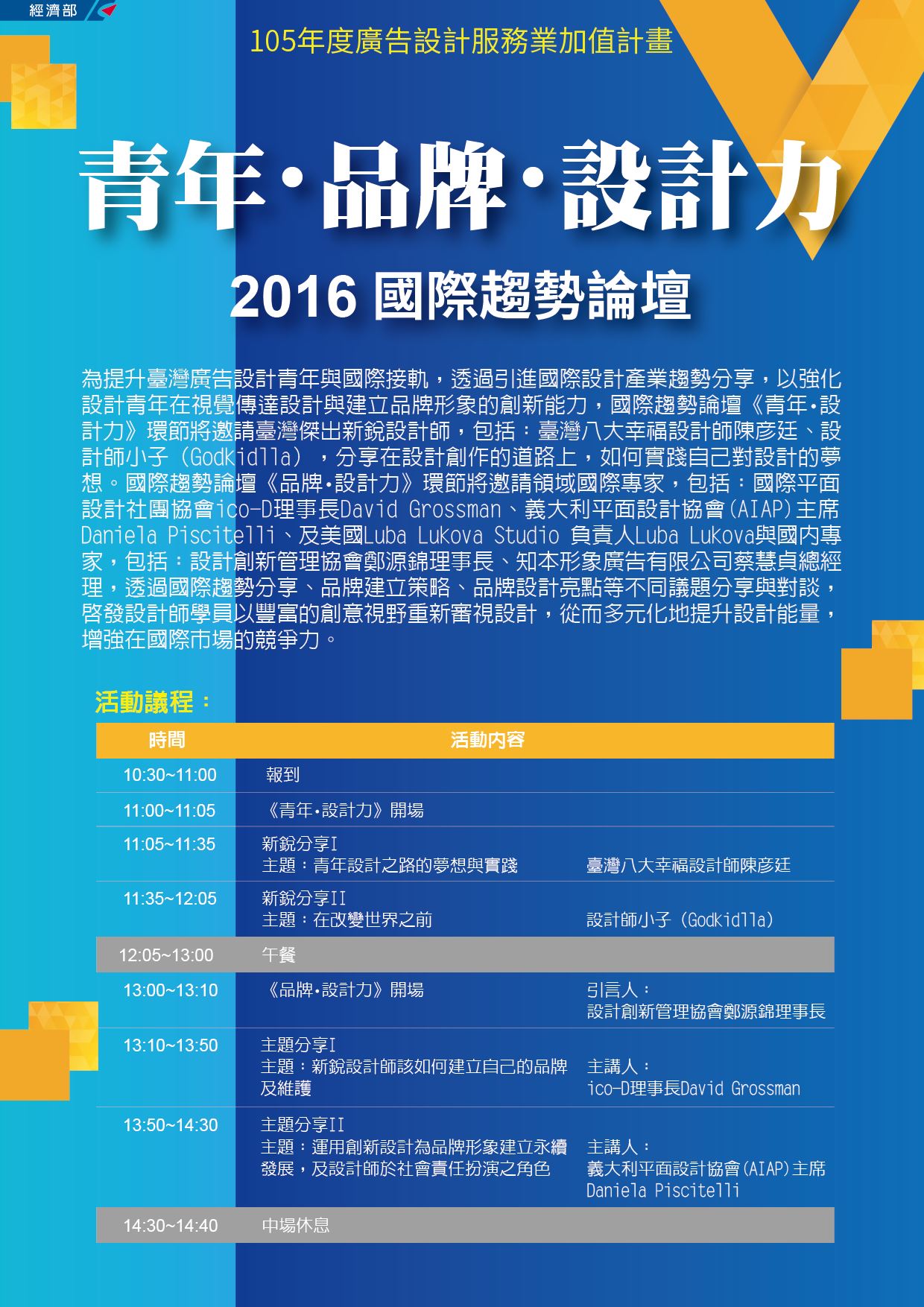 為提升臺灣廣告設計青年與國際接軌,透過引進國際設計產業趨勢分享,以強化設計青年在視覺傳達設計與建立品牌形象的創新能力,國際趨勢論壇《青年・設計力》環節將邀請臺灣傑出新銳設計師,包括:臺灣八大幸福設計師陳彥廷、設計師小子(Godkidlla),分享在設計創作的道路上,如何實踐自己對設計的夢想。國際趨勢論壇《品牌・設計力》環節將邀請領域國際專家,包括:國際平面設計社團協會ico-D理事長David Grossman、義大利平面設計協會(AIAP)主席Daniela Piscitelli、及美國Luba Lukova Studio 負責人Luba Lukova與國內專家,包括:設計創新管理協會鄭源錦理事長、知本形象廣告有限公司蔡慧貞總經理,透過國際趨勢分享、品牌建立策略、品牌設計亮點等不同議題分享與對談,啟發設計師學員以豐富的創意視野重新審視設計,從而多元化地提升設計能量,增強在國際市場的競爭力。