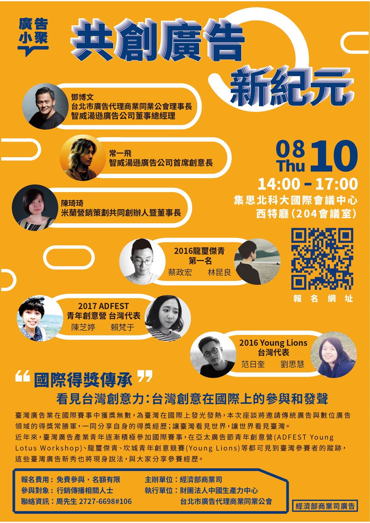 座談子題: 1. 臺灣廣告業如何自我成長與發聲 2. 如何借力使力發揮臺灣的創意軟實力 3. 國際經驗於創意提案之應用 4. 創作理念與商業應用之結合 5. Q&A |