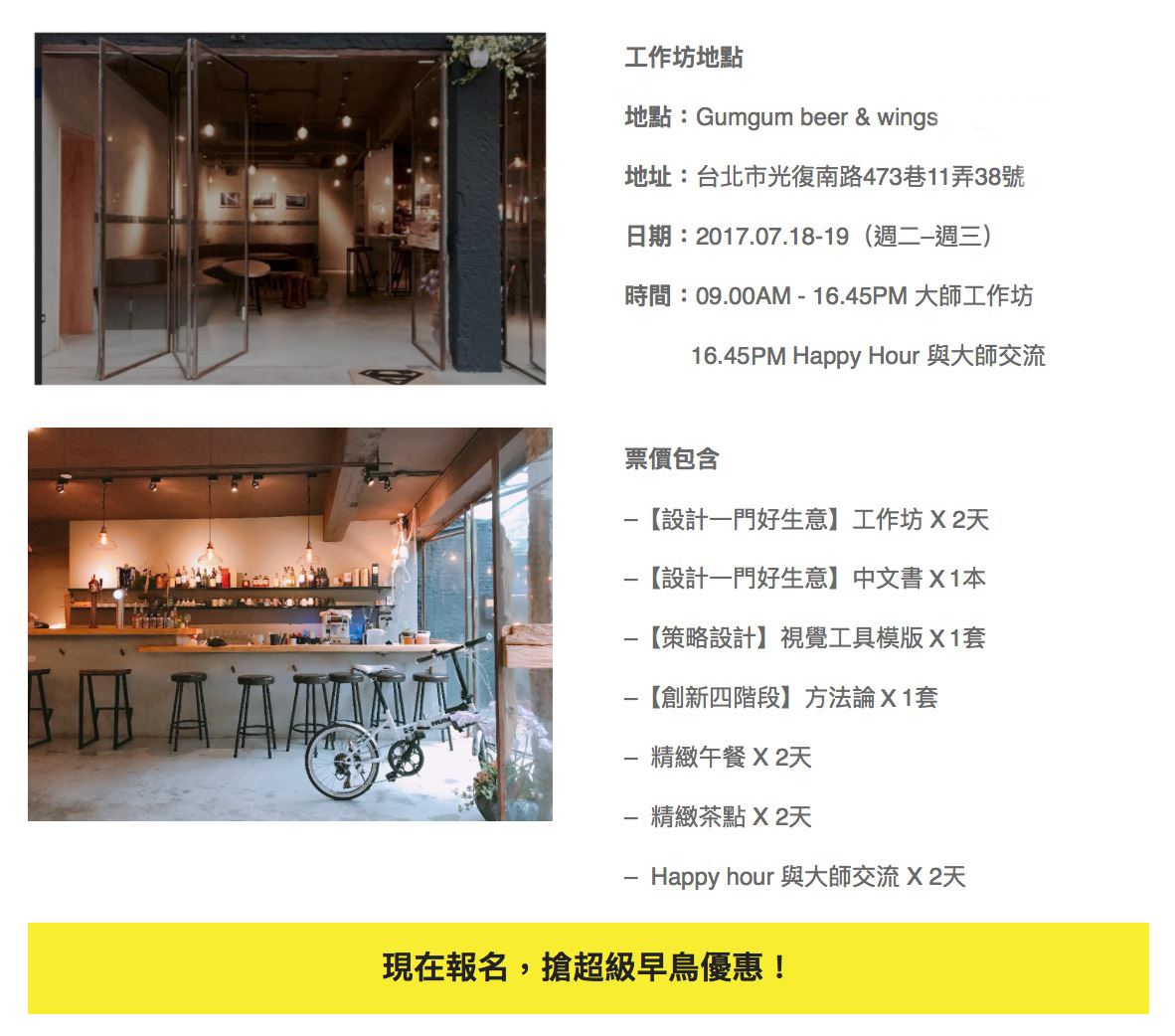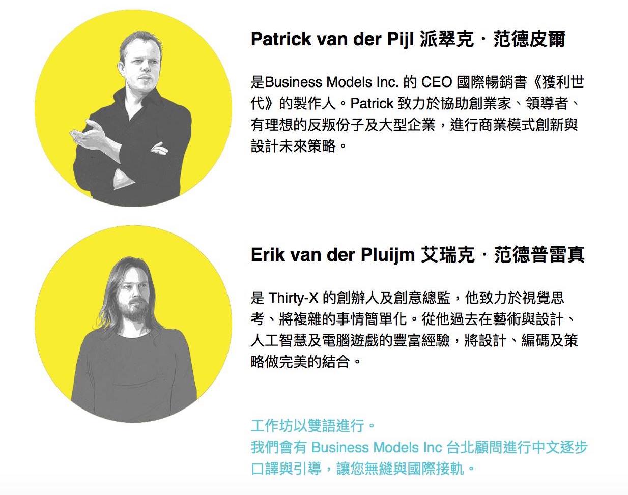 在歐洲、美國、澳洲已舉行多次的「設計一門好生意」大師工作坊,也受邀與美國設計管理協會(DMI, Design Management Institute)、奇點大學 (Singularity University Exponential Finance Forum)合作,這套方法連 ING銀行、Audi汽車、Autodesk、豐田金融都在用!