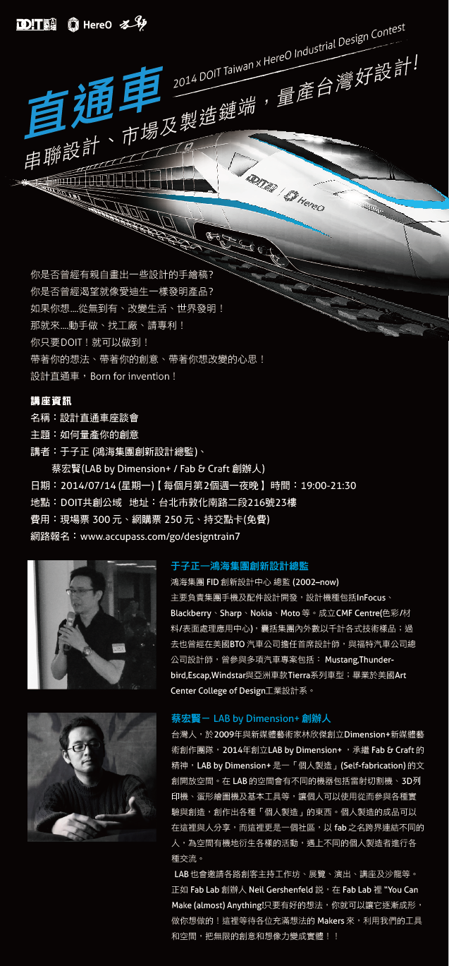 DOIT Taiwan 共創公域和 HereO 群眾募資平台聯手打造“設計直通車”大賽,結合業師指導講座,群眾募資,協同製作影片,公關宣傳,以及量產與通路推薦等服務,加速台灣好設計商品化,開啓第一部市場直通車。將於2014 年 9 月起正式啟航,希望能透過串連設計、產業及市場,協助更多台灣的好設計「量產」與「進入市場」。