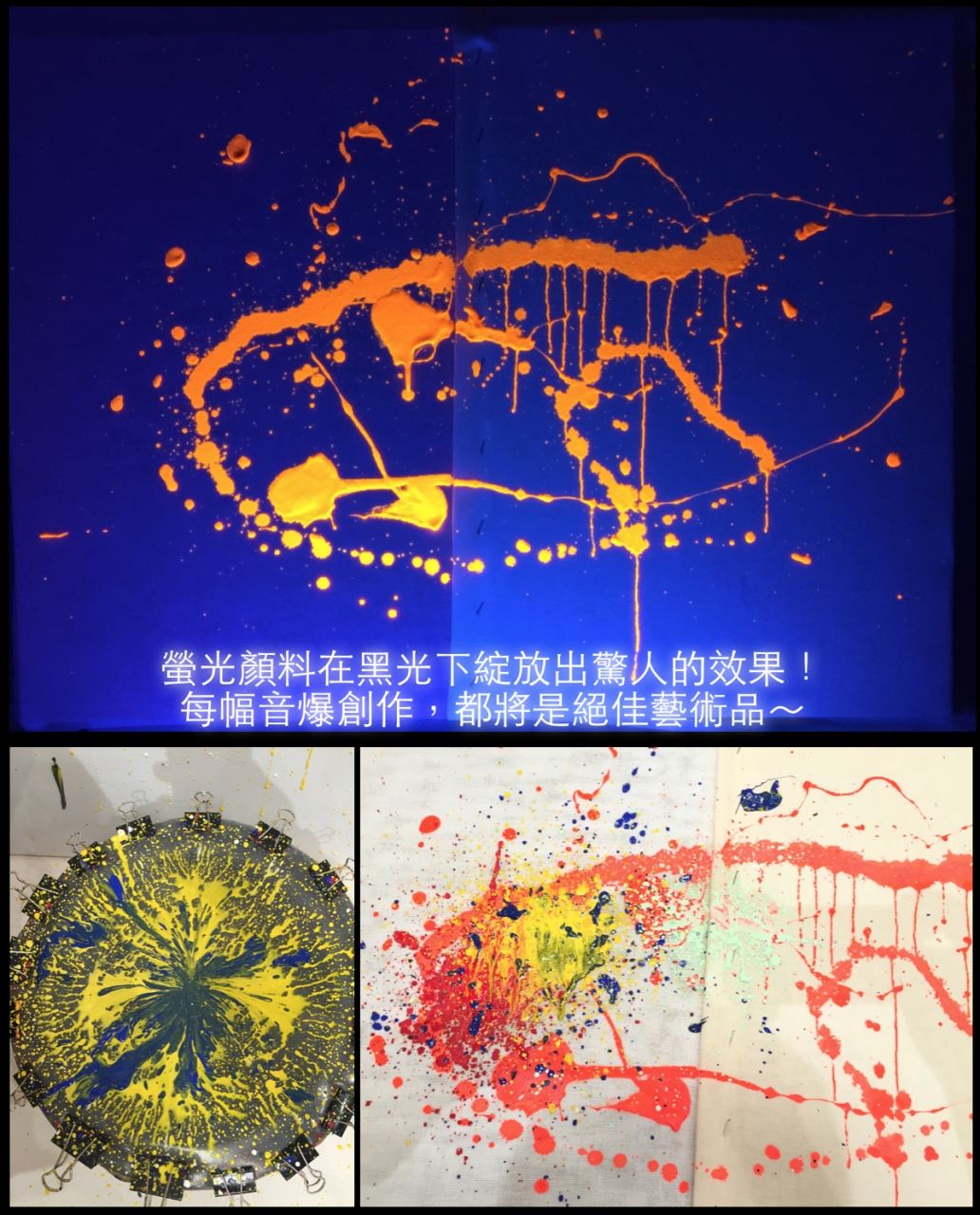 造出黑暗中的視覺與聽覺饗宴,運用音響共振的特性與顏料結合,讓聲音也能「被看見」。