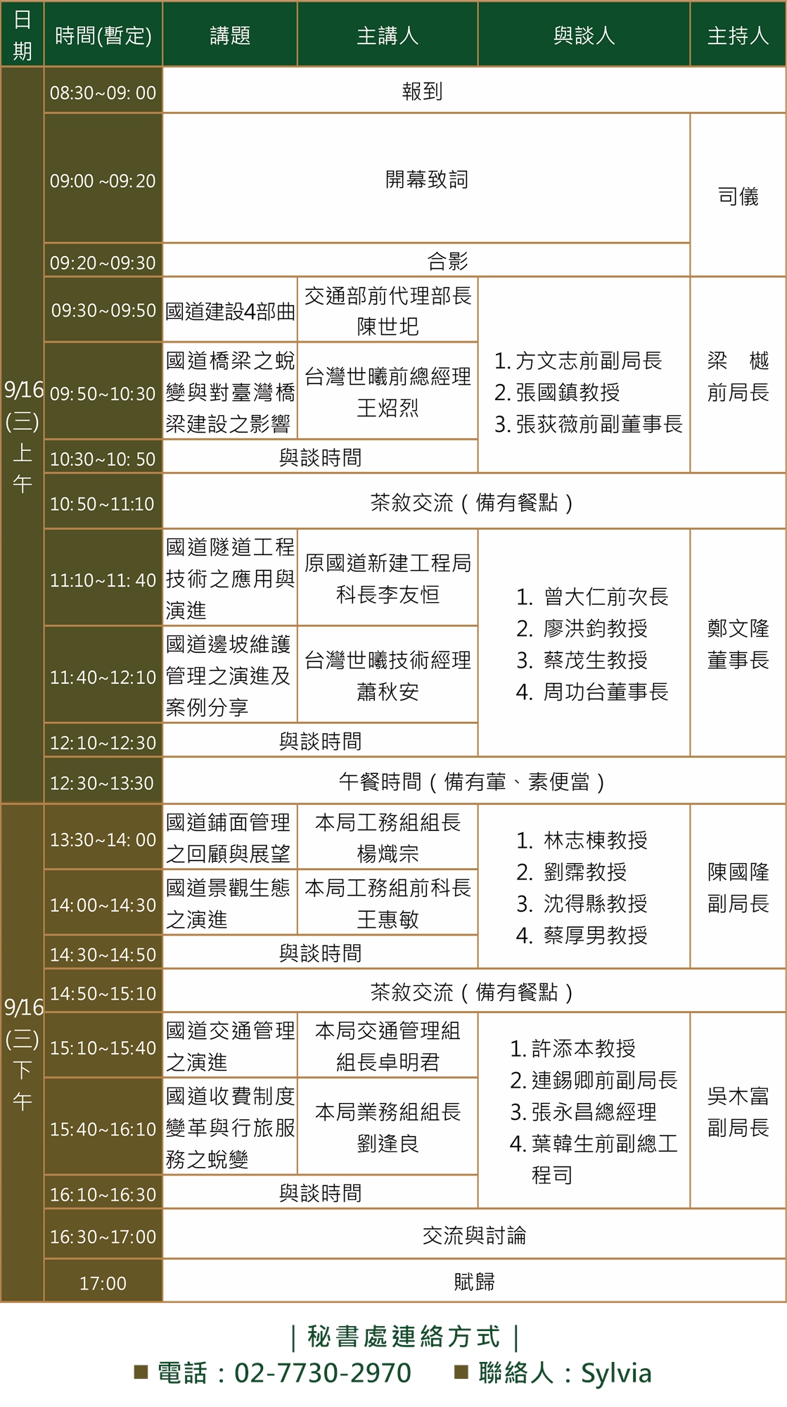 交通部高速公路局「50週年國道技術研討會」預定發表議題包括:「國道建設4部曲」、「國道橋梁之蛻變與對臺灣橋梁建設之影響」、「國道隧道工程技術之應用與演進」、「國道邊坡維護管理之演進及案例分享」、「國道鋪面管理之回顧與展望」、「國道景觀生態之演進」、「國道交通管理之精進」及「國道收費制度變革與行旅服務之蛻變」等8項。本次研討會邀請之主講人、與談人及主持人均為國道技術或工程相關領域的佼佼者,發表議題集合交通部高速公路局50年來之大成與精華,精彩可期。