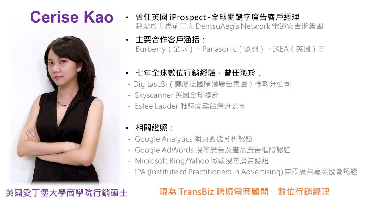 擁有七年國際一線品牌關鍵字廣告實戰經驗的「關鍵字廣告黑寡婦」Cerise Kao,