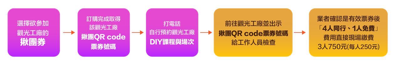 - 觀光工廠業者需確認是由本執行單位所規劃之「4人同行揪團券」活動所取得的QR code並列印的有效票券後,回收此QR code票券,並向揪團前往的民眾收取相關導覽與手作DIY體驗等費用,揪團同行的其中1人享有免費的優惠。