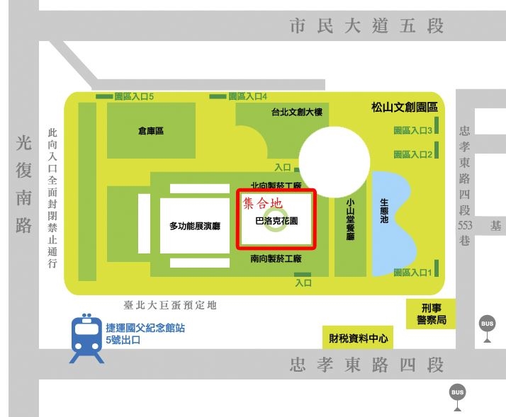 集合地點:松山文創園區 巴洛克公園的噴水池 (國父紀念館站 5號出口)