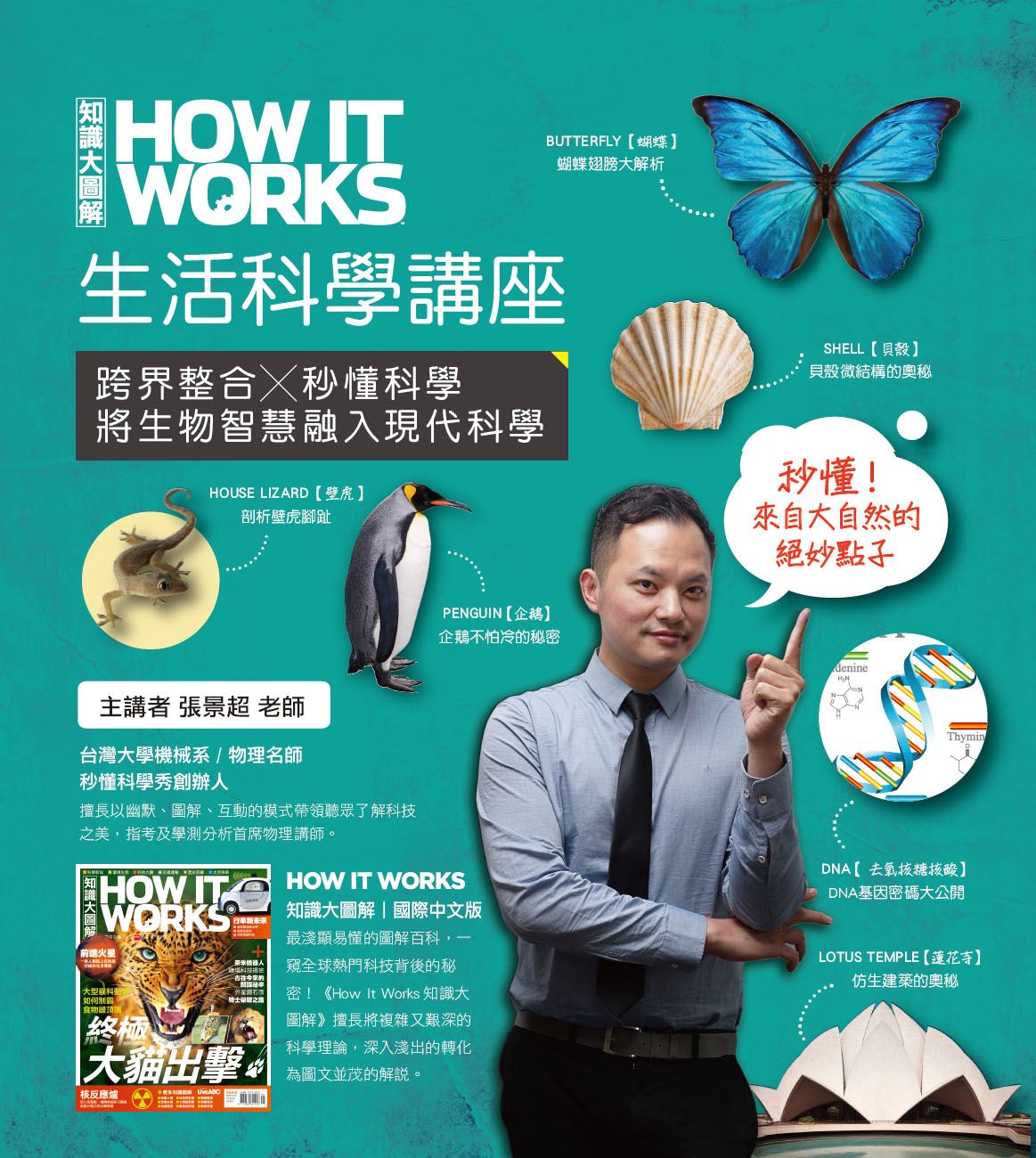 本次講座活動由《How It Works知識大圖解》主辦,特別邀請超人氣物理講師─張景超 老師來帶大家認識來自大自然中的絕妙發明。