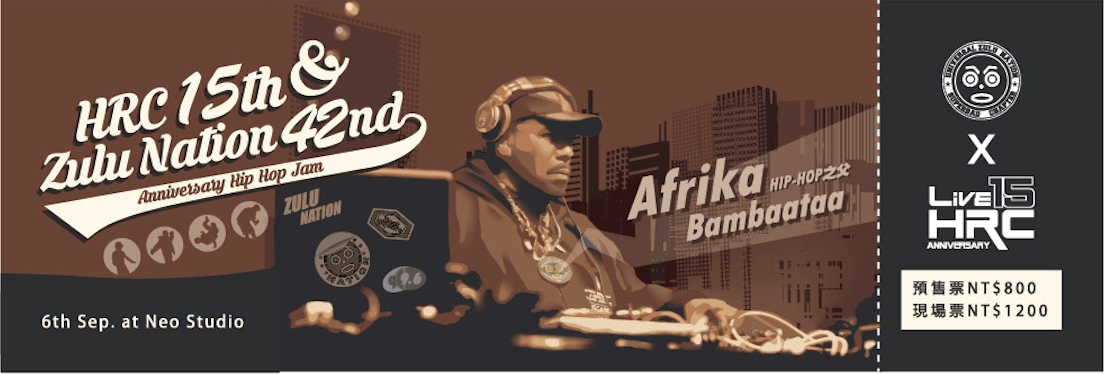 在HRC歡慶15週年的同時,今年也是Zulu Nation 誕生42週年,Hip-Hop 的一切是從1973年在紐約布朗克斯由DJ Kool Herc 所舉辦的一場戶外派對開始。而Afrika Bambaataa 不僅是第一位定義「Hip-Hop」詞彙的人物,更是成