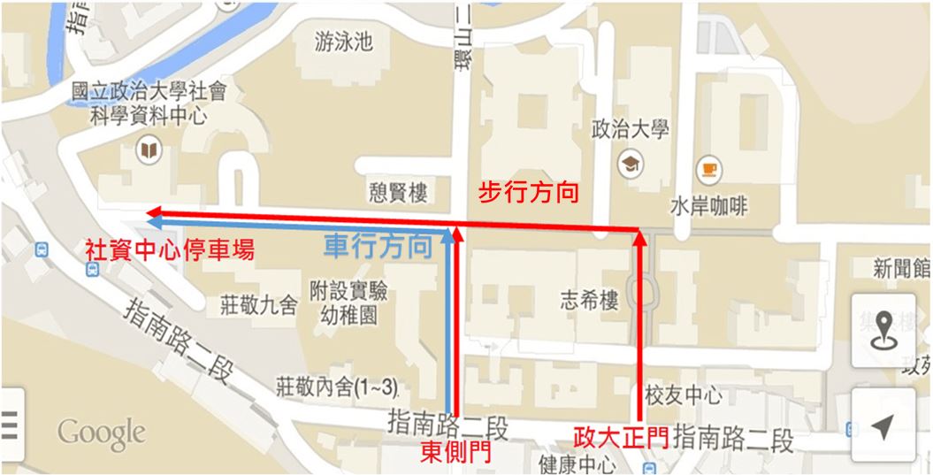 - 開車者(搭計程車者)請由東側門進入,於四維道左轉,即可抵達社資中心停車場(藍色箭頭)。