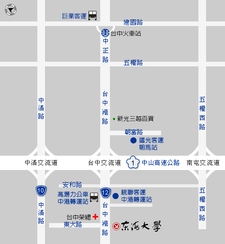 - 至朝馬、中港轉運站,搭乘 28、60、69 路,於「台中榮總(東海大學)」站下車,經地下道可至東海大學校門。